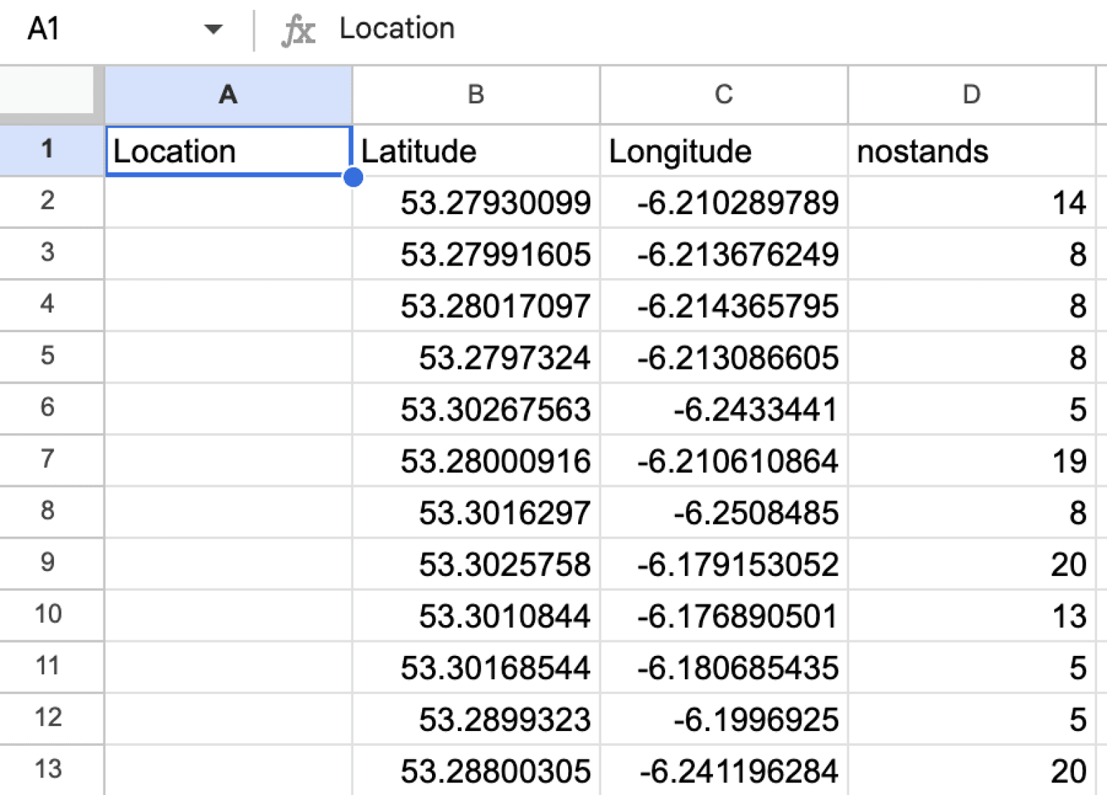 Raw dataset (bike parking locations + coordinates + capacity numbers).